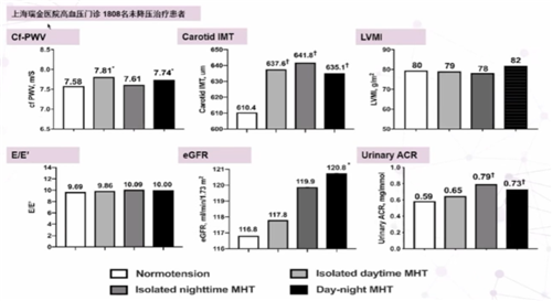 上海瑞金醫(yī)院對高血壓門診1808名未接受降壓治療患者進行研究,對不同隱蔽性高血壓亞型進行探索,結果發(fā)現,無論是何種隱蔽性高血壓患者(白天血壓增高、夜間血壓增高、白天和夜間血壓均增高)都會出現不同程度的腎臟、血管等靶器官損傷(圖2)。